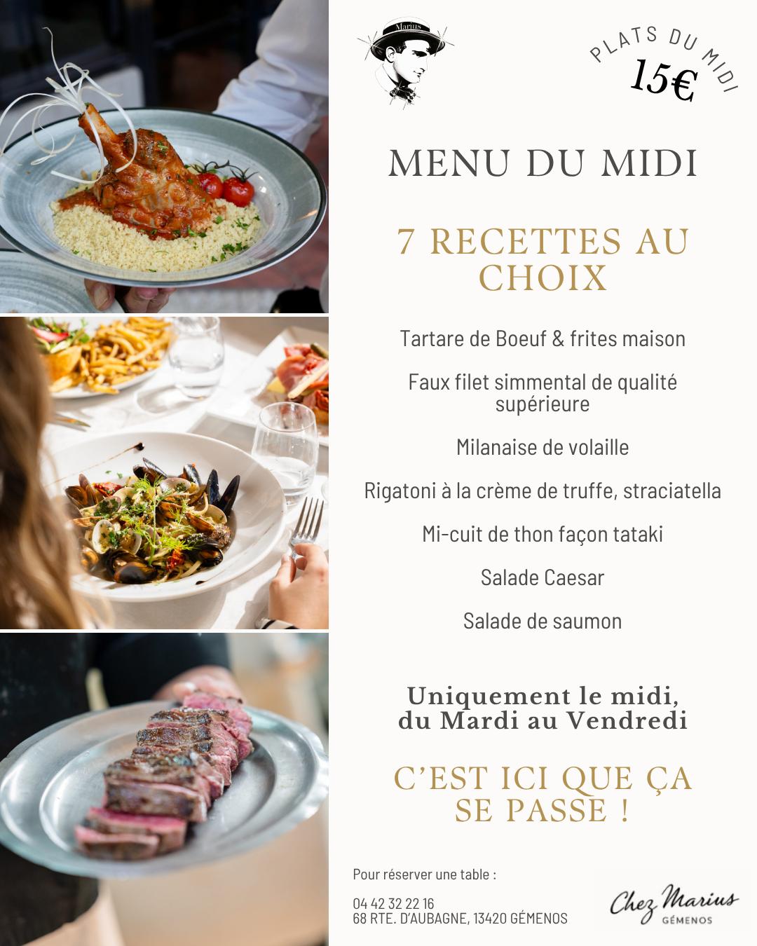 Chez Marius, la pause déjeuner, c’est sacré ! Une cuisine maison et authentique dans une formule à prix doux. Situé au cœur de Gémenos, notre restaurant pizzeria traditionnel vous accueille dans une ambiance conviviale et chaleureuse, idéale pour un repas en famille, entre amis ou entre collègues.